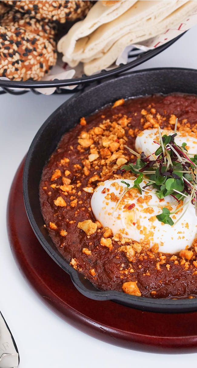 Poached eggs, house-made spiced labneh, chili garlic oil, sumac, microgreens.