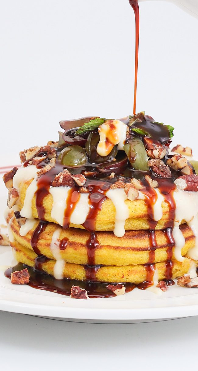 Traditional Emirati chabab with mixed grapes, brie cheese, dusted with white sugar, served with yuzu date molasses.