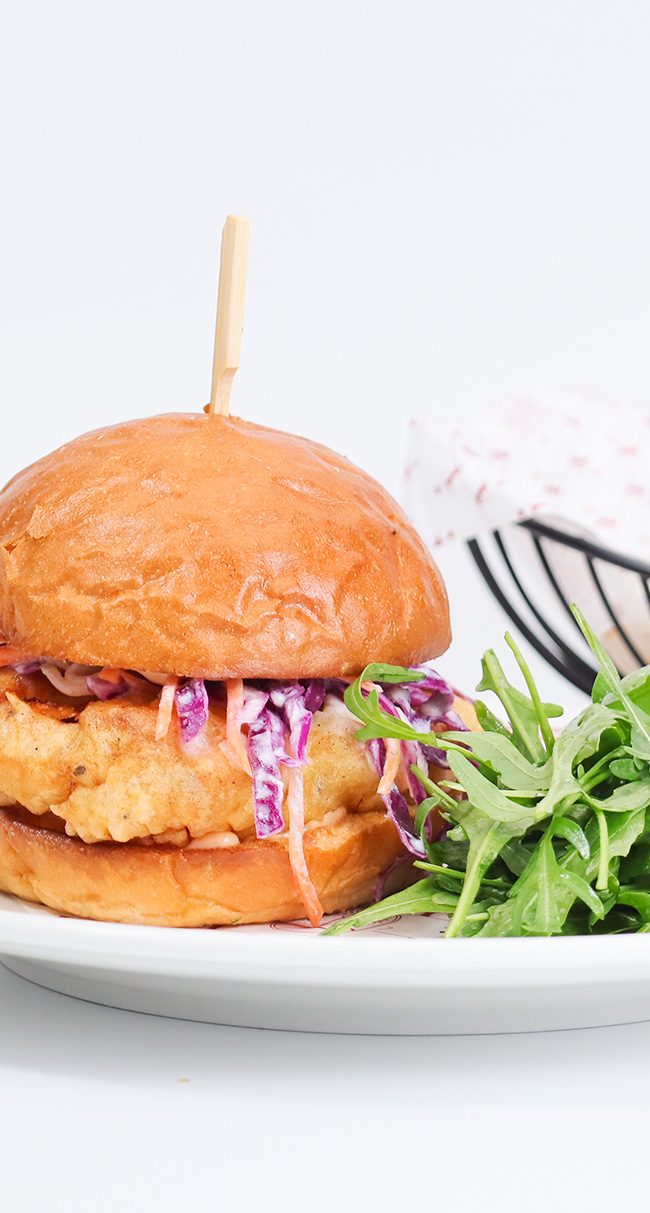 Black sesame-crusted crispy chicken, pickled kohlrabi, apple-cabbage-carrot maple slaw, toasted potato bun, house sauce.