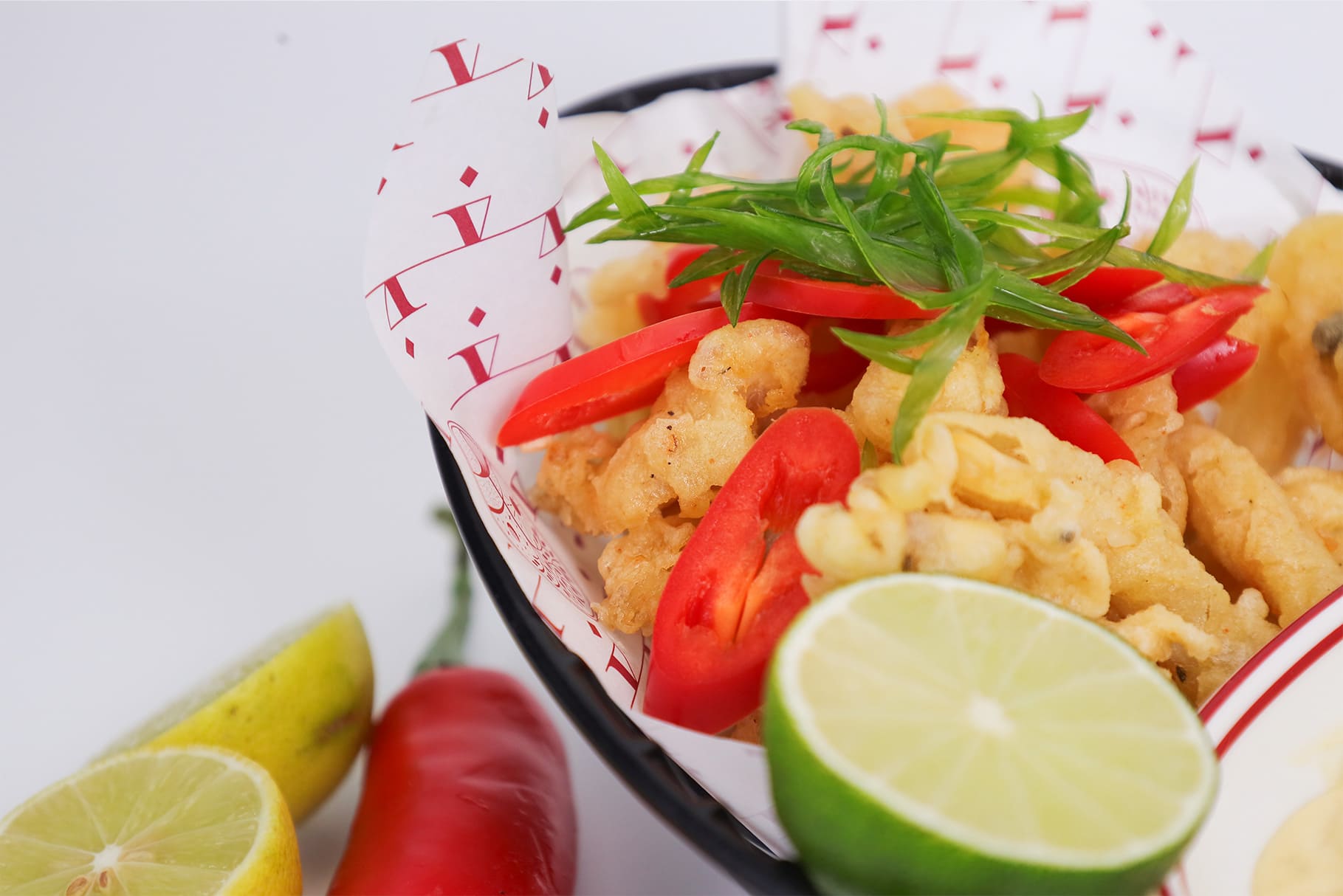 Crispy squid tossed in Chinese peppers, red chili, chives, served with lime and yuzu kosho.