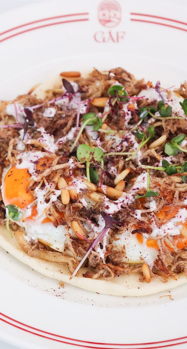 Feta bread, shredded chicken, fried egg, dukkah spice, crispy onion, sumac-lemon yogurt.