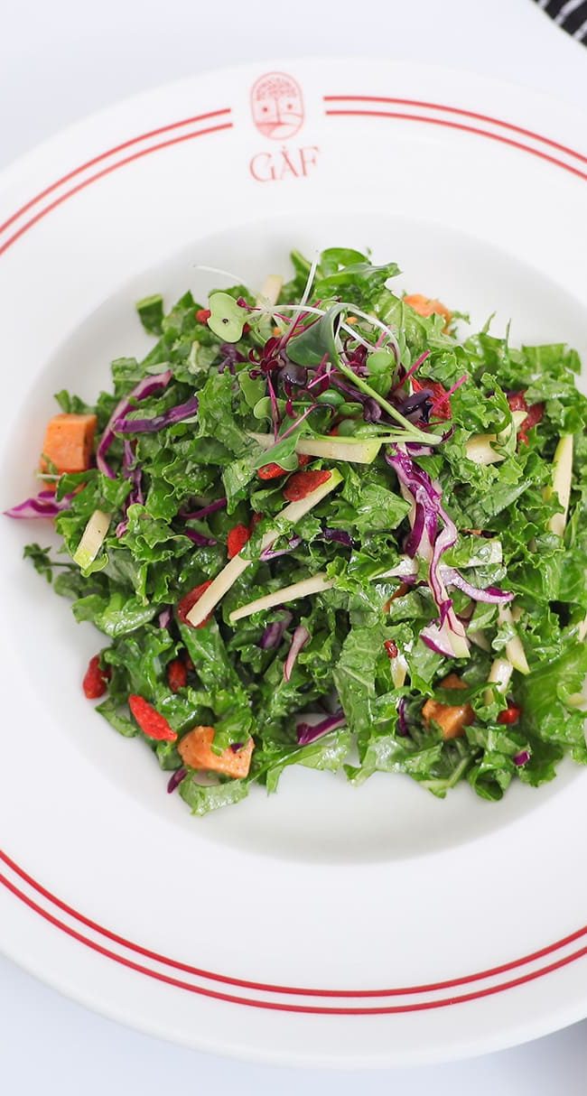 Fresh curly kale, roasted sweet potato, green apple, red cabbage, walnuts, goji berries, lemon-Dijon vinaigrette.